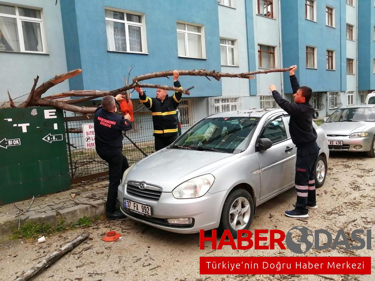 Karabükte kuvvetli rüzgar nedeniyle devrilen ağaç araçlara zarar verdi