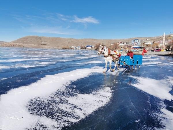 Yüzeyinin büyük bölümü donan Çıldır Gölü nde ziyaretçiler atlı kızakla geziyor